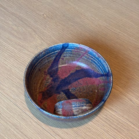Lysestakei keramikk med blålilla farge. Lysestaken har en bølget form og en lys bunn. Egnet for standard stearinlys.