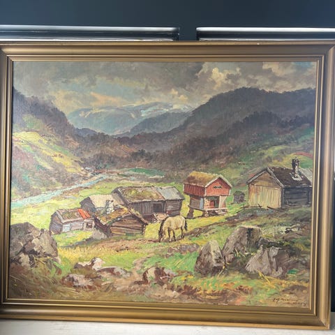 H-50 cm -B-79 cm- motiv fra seter/tun og snø dekte fjell. Signatur A.L. Kan leveres i omr. Sandnes/Stavanger/post nord!
