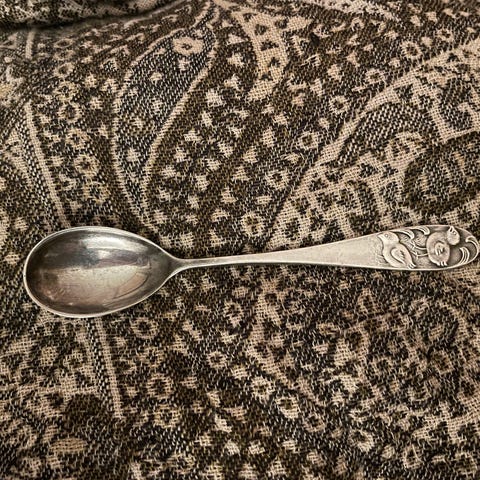 Ukjent merke sølvkrukke med dekorative detaljer og tre små ben. Egnet for oppbevaring av små gjenstander eller som dekorativt element.
