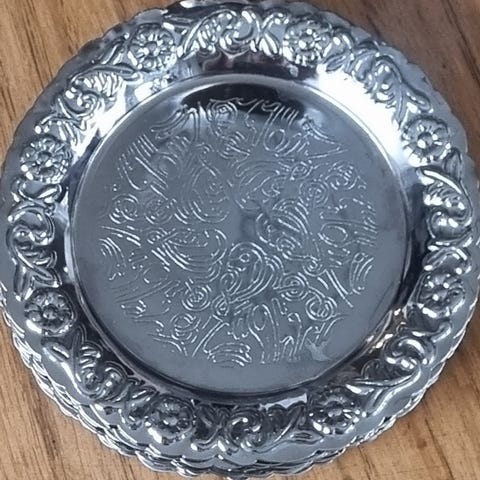 4 fine plater i sølvplett til glass. Svensk produsert. Bør pusses. Selges kr 100,-(t23)