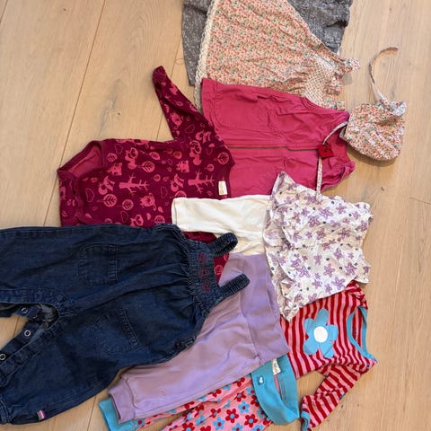 Hele og pene klær. 4 bukser, 2 bodyer, 2 luer, 3 gensere og én kjole.