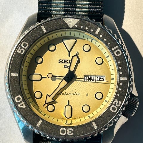 Har byttet bezel insert til en med lume I dyp blåfarge, samt satt på en veldig komfortabel blå gummireim som kler den godt (begge fra AliExpress). Den originale blå og røde inserten kasta jeg og følger da ikke med, men en mørk blå yacht master insert (AliExpress igjen) istedenfor. Original lenken følger med (oyster stil), men ekstraledd har blitt sporløst forsvunnet. Lenken har del riper og passer et håndledd på omtrent 19,5cm + -.