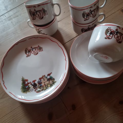 Koselig juleservise med tradisjonell dekorasjon.