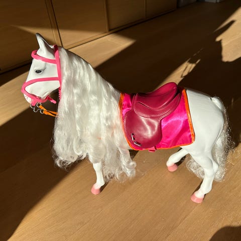 Hvit hest med sal fra Our Generation selges. Ingen liten ponni det her: høyde 52 cm, lengde 58 cm.