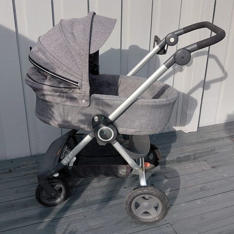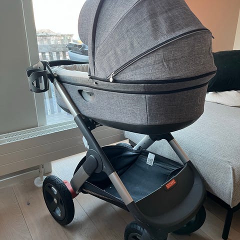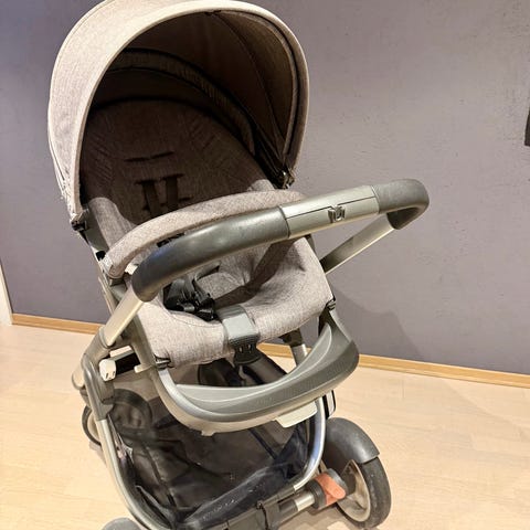 Stokke Trailz med sittedel selges. Godt brukt, men alt fungerer. Bakhjulene er plastikk/gummi (ikke luftfylte), mens framhjulene er byttet ut til luftfylte. Har ikke liggedelen. Solid Tinkafu regntrekk med skjerm følger med.