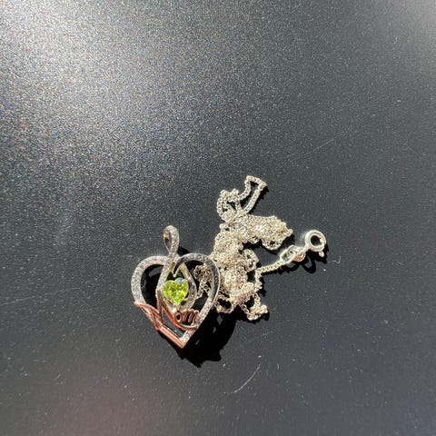 Kjede merket 835S og vakkert anheng i 925S. En grønnaktig sten og 3 små i gult og hvitt. 3cm langt. Kjedet måler 39cm