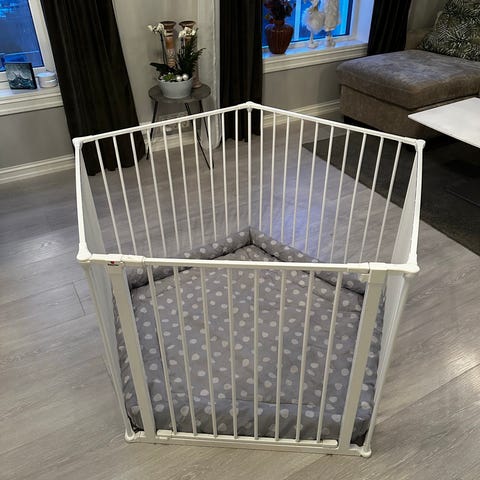 Barnegrind med dobbel bunn. Høyde 73 cm bredde og lengde 104cm. Selges for den ble for stor for vårt bruk. Flere justerbare høyder på bunnplate. Bør hentes.