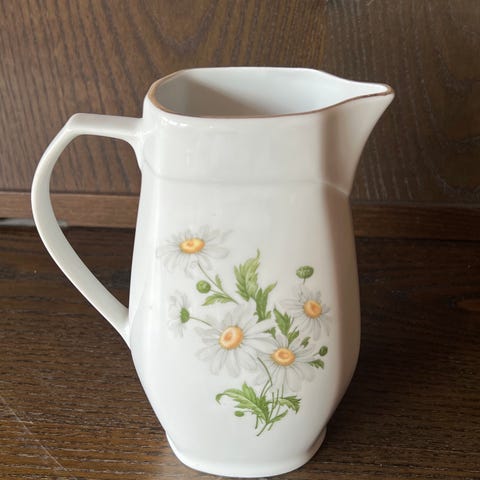 Søt, gammel mugge / melkemugge med dekor av prestekrager. Ingen nagg/krakelering. Brunt stempel under, men kan ikke tyde det.