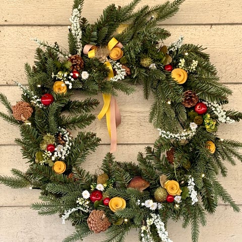 Kransen er laget av kunstige eviggrønne grener og pyntet med kongler og et rutete bånd.