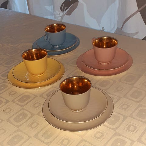 6 mocca kopper, med gull hank, 6 skåler og 6 asjetter. Mokka servise er i 11 forskjellige farger, fargene gul, grønn, terracotta, rosa, mørk grå, brun og blå. Asjetter er i lysere nyanse enn kaffekopper og skåler, noe som gjør det mer spennende og elegant! Grå kopp og skål har rosa asjett, flott kontrast. Du kan mikse fargene om hverandre. Veldig pene. Noe bruksmerker vil du finne. Grønn og blå kaffe kopp har et knapt synlig merke på topp. Gull kant på alle deler, og gull innvendig på espresso kopper.