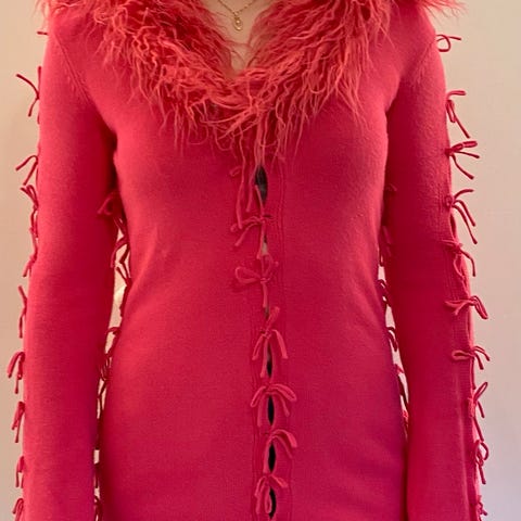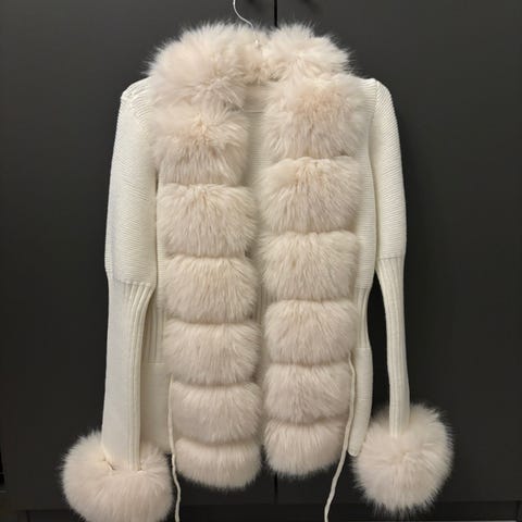 God og varm cardigan med fuskepels,og lommer på sidene .