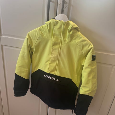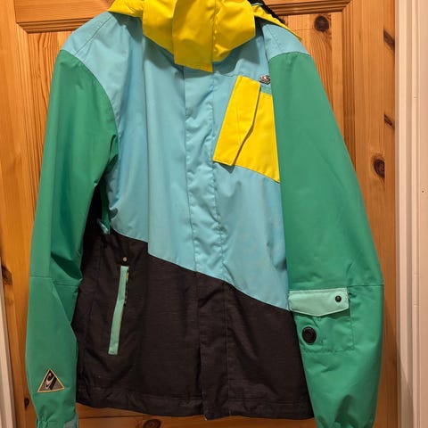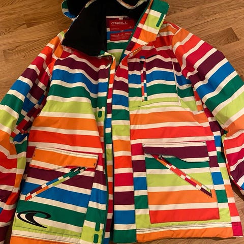 Passer til ungdom. Med lukning i livet på innsiden, festestropper i nedre kant, tre ytterlommer og borrelås over glidelåsen. Har to i forskjellige farger, lik str.