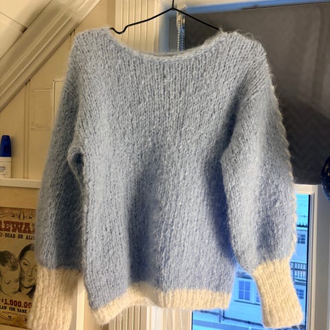 Pent brukt genser I farge korall. Mønsteret heter magnolia blom.