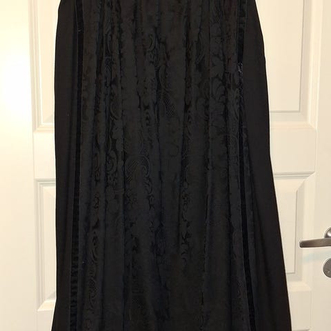 Pakken inneholder påtegnet stoff til liv, lue, borden over bysten / hektebandet, forklebord, stakkebord, broderigarn, mønsterplansje, fløyelsbånd. Stoffet er svart, to-skaft fra Gudbrandsdalens Uldvarefakrikk
