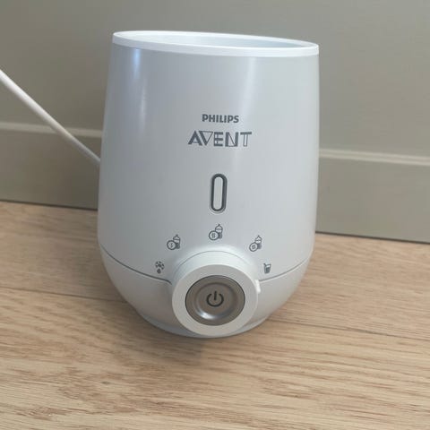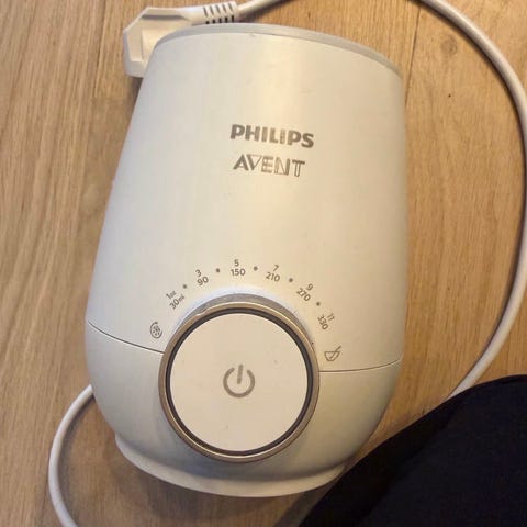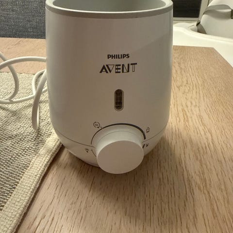 Philips Avent flaskevarmer med enkel kontrollknapp for oppvarming av flasker. Enheten har en rund form og en hvit farge. Egnet for oppvarming av babyflasker.
