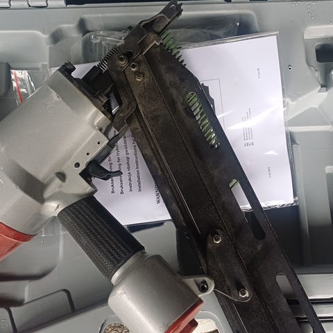 Spikerpistol med tilhørende ekstra tilbehør. Verktøyet har et håndtak med oransje grep og metallkropp. Egnet for spikring i ulike prosjekter.