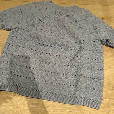 Hjemmestrikket t skjorte, strikket i Petunia fra Rauma Garn.