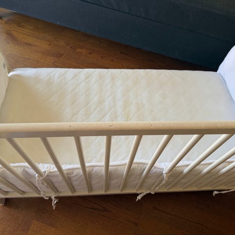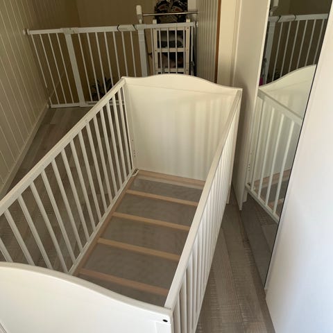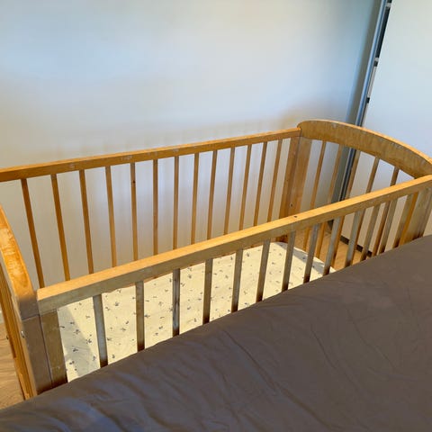Barnashus:Sprinkelseng barneseng i rosa treverk.(malt over gult). Designet for små barn med spiler på sidene for sikkerhet og ventilasjon. Passer til standard barnemadrass. Kan justeres opp og ned, etter behov.
