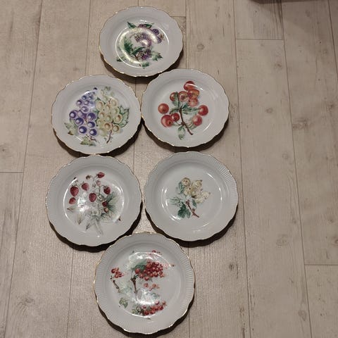12 stk + stettefat Firkløveren samlertallerkener med gjennombrutt kant og dekorative botaniske motiver. Tallerkenene har ulike frukt- og blomsterillustrasjoner i farger, med detaljer i porselenet. Egnet for samling eller dekorativ bruk.