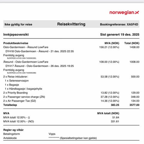 2stk LowFare+ Norwegian billetter tur /retur Ålesund -Oslo, 5-7 Desember