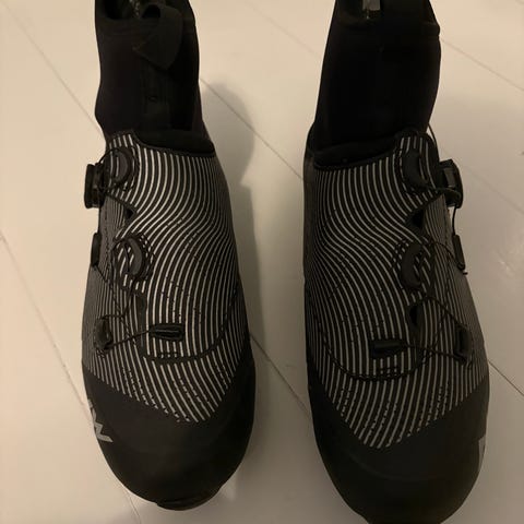 Skoene er svarte og har borrelås og spenne for justering. Designet for bruk innen sykling med slitesterk såle og god passform.