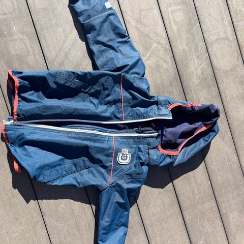 Fin jakke fra Didriksons i str. 120. Noe slitasje ved glidelås i front og et lite hull på armen, se bilder.