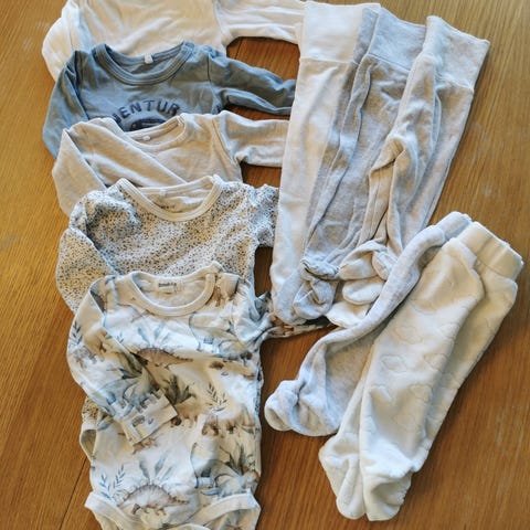 Klespakkke med 8 bodyer og en matchende bukse str 50 og 56.