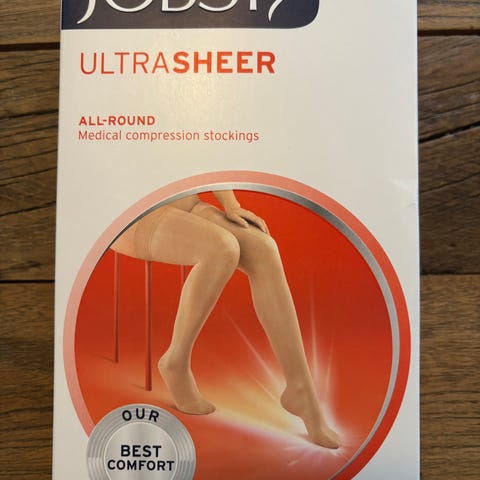 En ny strømpe selges, da det bare var behov for en strømpe ifm operasjon. Begge strømpene kostet kr 856,70. Selges for 300 kr.