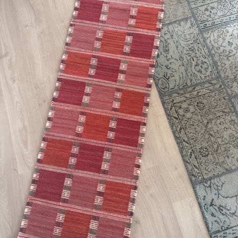 Løperteppe med striper i rosa, hvitt og grått. Teppe har frynser i begge ender. Passer til bruk i gang eller smale rom.