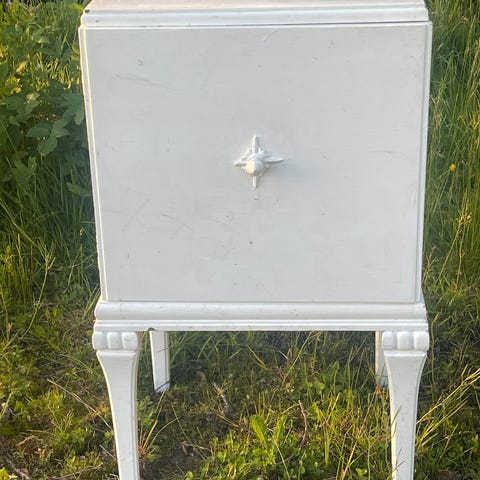 Romy er av mattlakkert furu - noen små bruksmerker men synes ikke tydelig - spesielt ikke dersom du har ting stående på bordet!