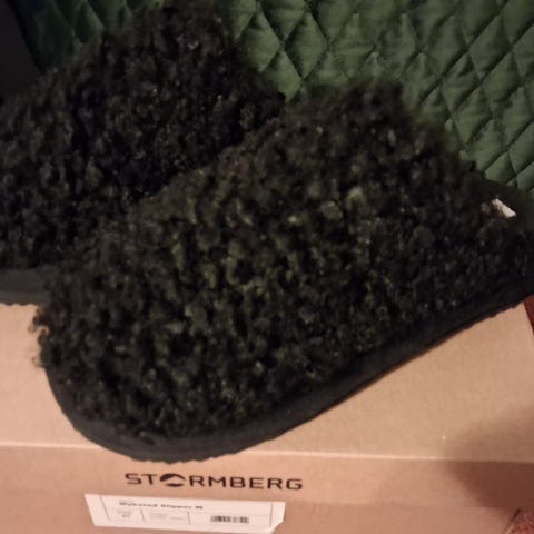 Montechristo skinn/pels slippers. De er sorte. Porto kommer i tillegg v/sending.