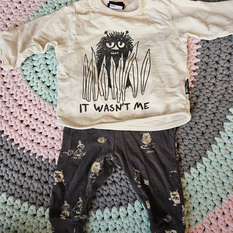 Kjempe fint sett med mymlen fra mummitrollet i str 68, nypris 299,-