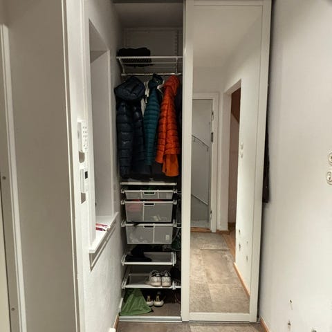 4 dør 102cm x 218cm. (2 speil og 2 lyseik mønster). Tak og gulv list 400cm. Har vært i et rom med høyde 222cm. Alt fungerer. Ingen skade. Kun dør og ingen skap. Vi brukte med 4 stk 100cm Ikea pax, slik at alle skuffer og uttrekk fungerte uten konflikt med dør.