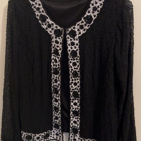 Nydelig og vakker retro jakke, blazer med flott og intrikat mønster av perler og broderi. Virkelig forseggjort og unik, perfekt hvis man vil føle seg litt ekstra fin. Pallettet i svart, hvitt og sølv gjør den veldig anvendelig.