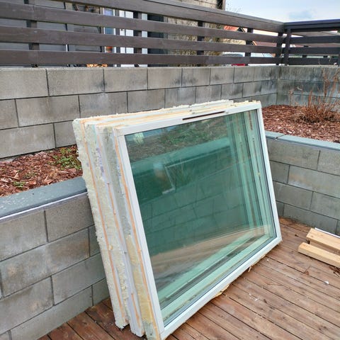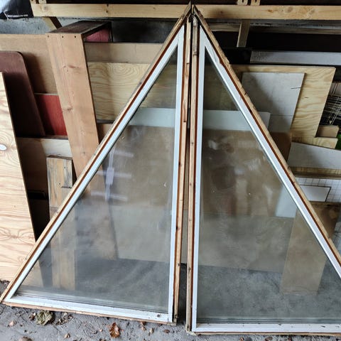 Trevindu med tre deler, malt hvit. Mål: 158x188 cm. Vinduet viser tegn til slitasje og maling er avskallet flere steder. Passer til bruk der eldre vinduer kan gjenbrukes eller til reparasjonsprosjekter. Litt maling og vinduet er "godt som nytt".