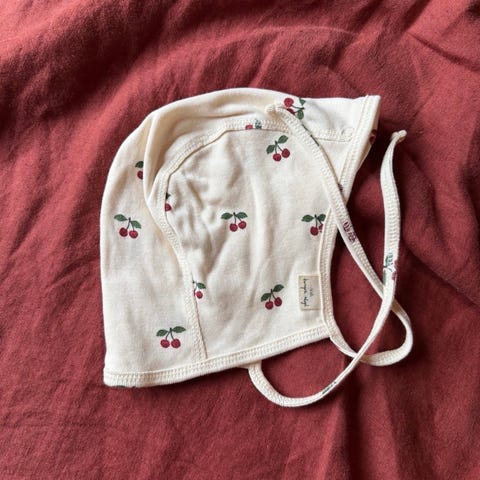 Nydelig håndlaget bonnet fra Shirley Bredal i størrelse 18–24 måneder. Brodert for hånd med små sitroner 🍋 på mykt, beige bomullsstoff. Den kommer med originale tags og er helt ny og ubrukt.