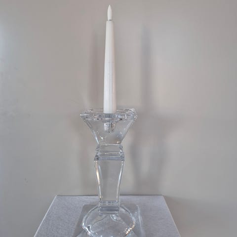 Elegant, høy lysestake laget av gjennomsiktig krystallglass i en moderne, geometrisk Art Déco/Glamour-stil. Den har en fasettert stamme og en solid, firkantet base, der det er synlige indre, melkeaktige flekker (sannsynligvis en defekt fra 3D-lasergraveringen).