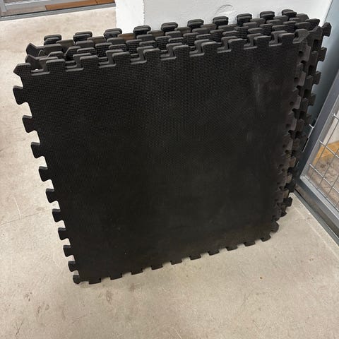 Jeg selger gulvmatter som jeg pleide å legge ut på treningsstudioet mitt for ikke å skade gulvene. Nå har jeg verken treningsstudio eller plass til ekstra ting. Jeg kutter dem i forskjellige mål for å passe til gulvformen.