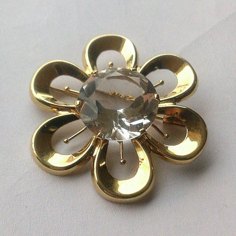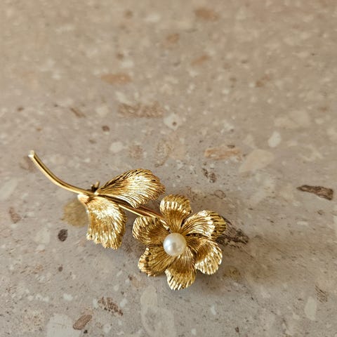 Brosje i gull . Veier 4 gram på kjøkkenvekten hjemme . Ca 3 cm bredde / høyde .