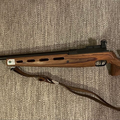 Skytterdrakten er godt brukt og i størrelse 48 overdel og 50 underdel, brukt av en på 175 cm. Fungerer fint som nybegynnersett/låneutstyr.