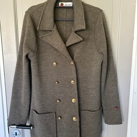 Busnel jakker i ull for dame, størrelse 40. Jakken er beige og laget av 100 % ull. Den har dobbelspent knappelukking med dekorative knapper og to frontlommer. Jakken er produsert i Frankrike.