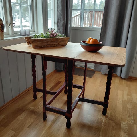 Pent Budal bord. Lengde utstått 114cm, bredde 74 cm, høyde 74 cm.