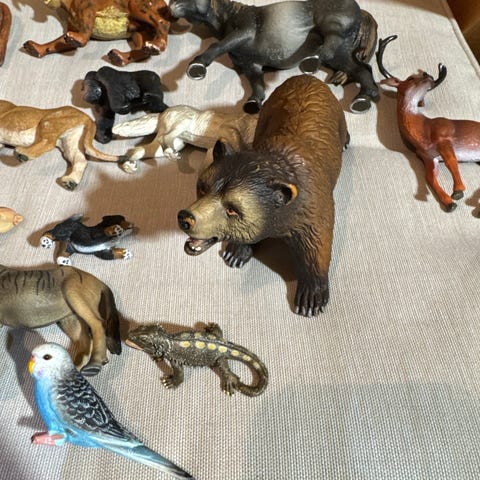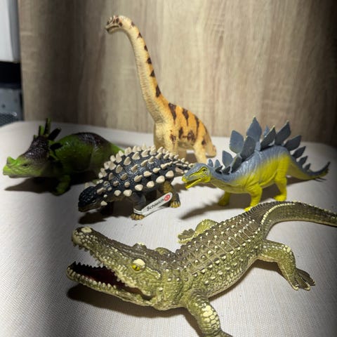 Tre figurer av reptiler selges samlet. To av figurene er plassert på ekte trerøtter, den tredje er kunstig.