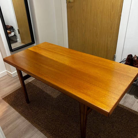 Expandable teak sofa table that needs some care but it’s great. We’re selling because we no longer have space.