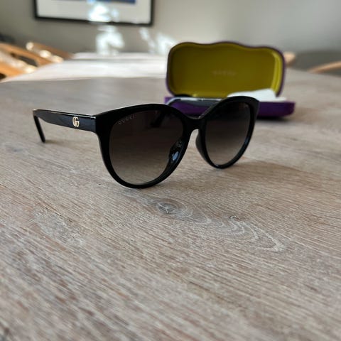 Gucci Dame solbriller med svart innfatning og mørke glass. Solbrillene leveres med et hardt etui med Gucci-logo. Designet for damebruk.