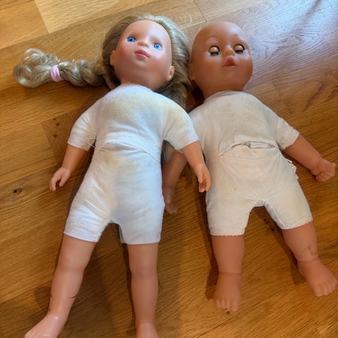 Baby Born dukker i plast og tekstilmateriale. To dukker, hvorav en er kledd i hvit tekstil og den andre er naken. Dukker med blå øyne og detaljer i ansiktet. Egnet som leketøy for barn.150kr for begge to.26cm langt