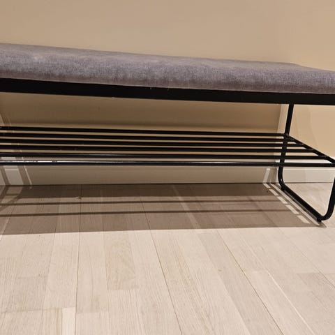EGEDAL Benk med lysegrå fra Jysk, Laget for innendørs bruk som sitteplass eller fotstøtte. Den er helt nytt bare tatt esken og montero den , selges videre pga plass mangel. Den kostet 1299kr