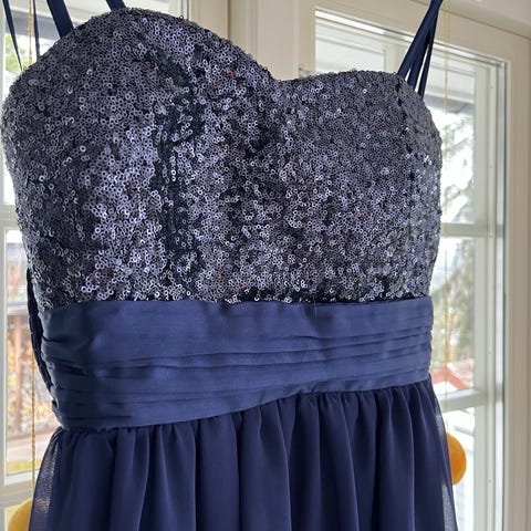 Nelly festkjole i blå farge, størrelse 36 for damer. Laget av polyester materiale. Kjolen har en design egnet for festlige anledninger. Paljetter og flott rygg