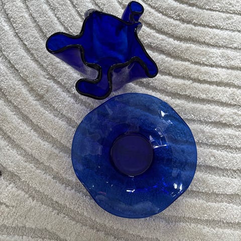 Magnor Glassverk dekorasjonsornament laget av glass. Produktet har en rund form med en bred, flat topp i klart og blåtonet glass.