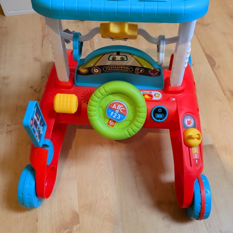Fisher-Price krabbeleke / lære å gå leke. Inkluderer hjul for bevegelse og interaktive elementer. Egnet for små barn.